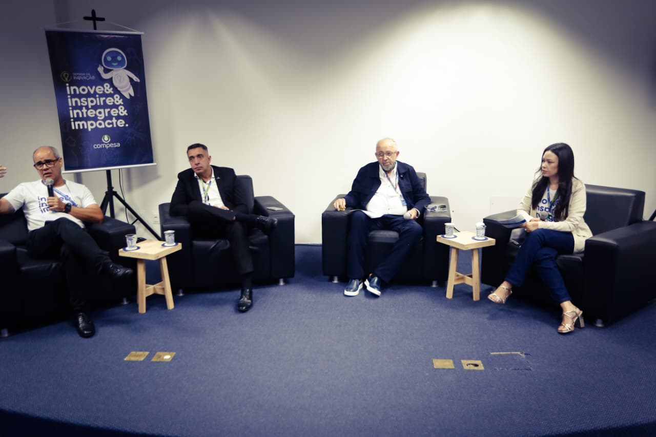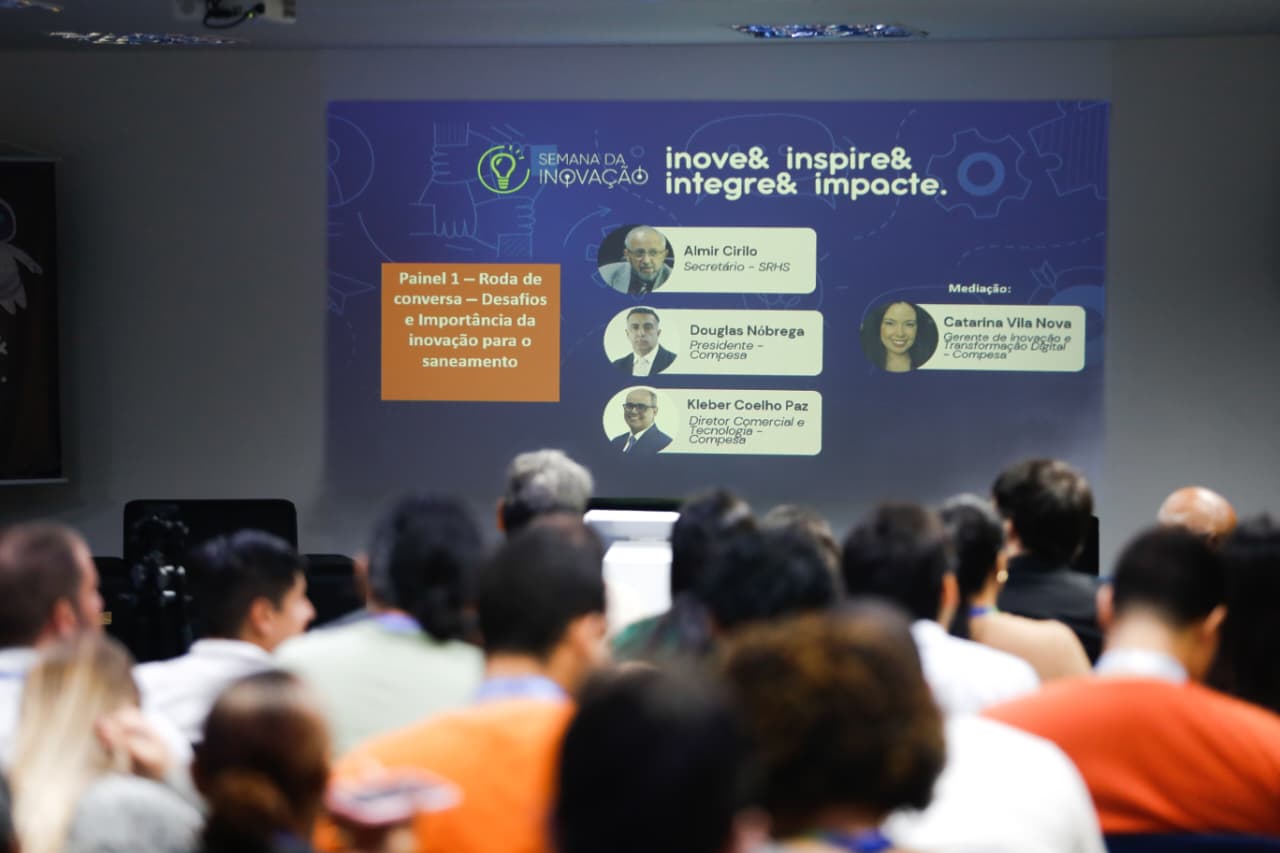 Nesta quinta-feira (4), a Secretaria de Recursos Hídricos e Saneamento (SRHS), participou da Semana de Inovação da Compesa 2025, em nome do seu Secretário, Almir Cirilo e o Secretário Executivo de Saneamento, Artur Coutinho. O evento acontece anualmente e é composto por palestras, painéis e trocas de experiências, com o propósito de discutir as soluções inovadoras que estão sendo empregadas e as que estão para ser utilizadas no saneamento básico de Pernambuco: abastecimento de água potável, esgotamento sanitário, manejo de águas pluviais e manejo de resíduos sólidos. O evento teve início com a roda de conversa Desafios e Importância da Inovação para o Saneamento, com a presença do Secretário da SRHS, Almir Cirilo, e mediação da Gerente de Inovação e Transformação Digital da Compesa, Catarina Vila Nova. Compuseram a mesa também o presidente da Compesa, Douglas Nóbrega e o Diretor Comercial e de Tecnologia da Compesa, Kleber Coelho Paz.