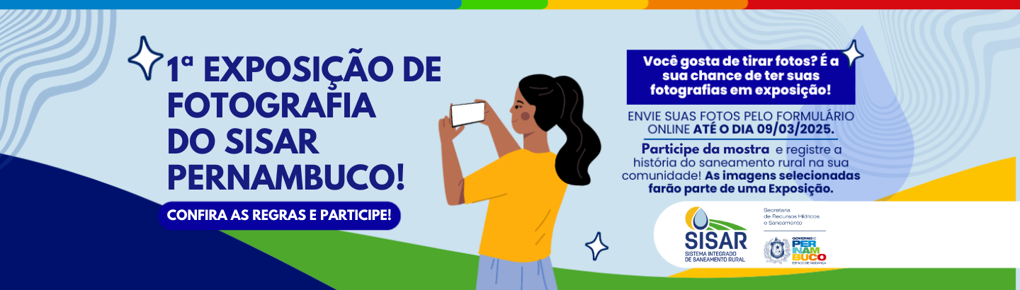 Estão abertas as inscrições para a 1ª Exposição de Fotografia do Sistema Integrado de Saneamento Rural, o Sisar Pernambuco. Para participar, os interessados devem enviar fotografias que contem a história do saneamento rural em suas comunidades, através do formulário online, disponibilizado no nosso sítio na internet – o www.srhs.pe.gov.br