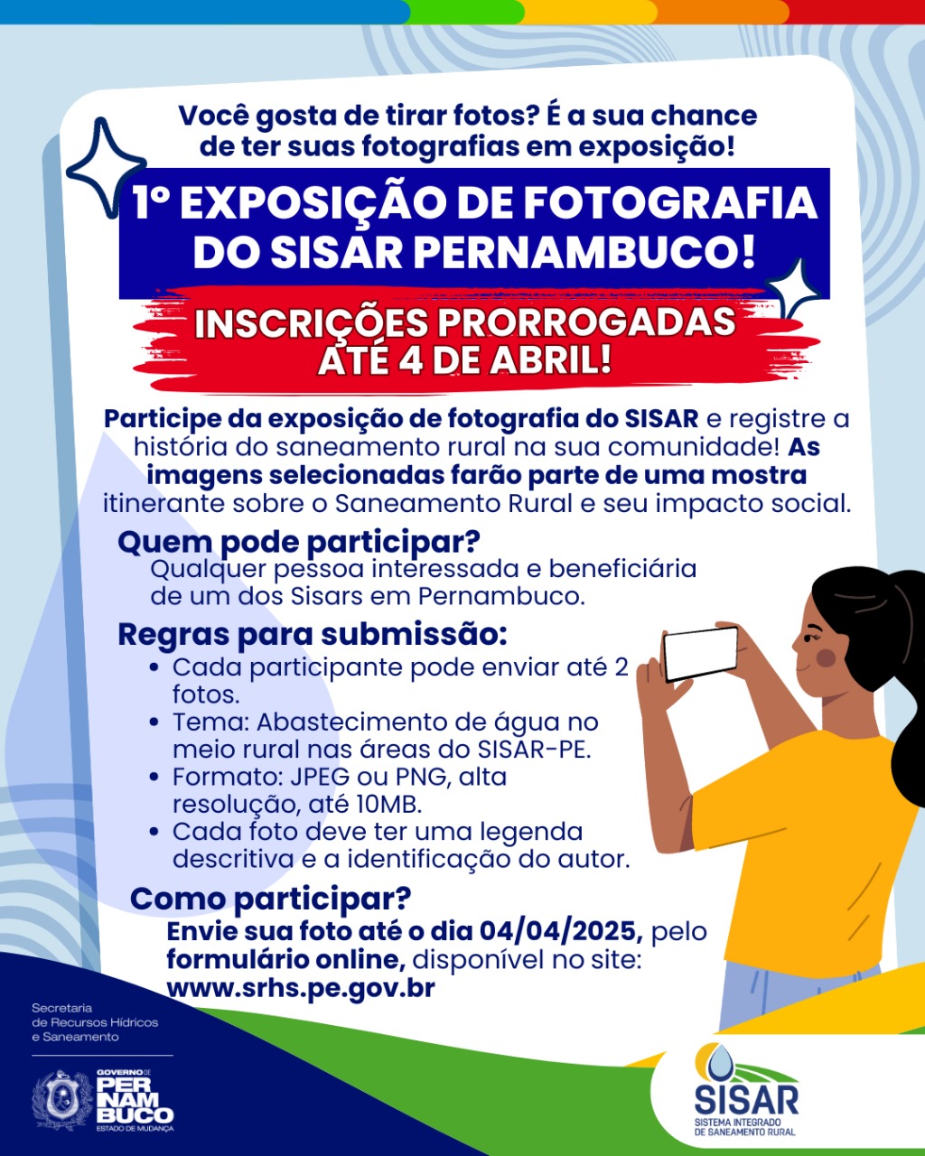 1ª Exposição de Fotografia do Sisar Pernambuco Prazo: envio de fotografias até 4 de abril de 2025 Inscrições: www.srhs.pe.gov.br